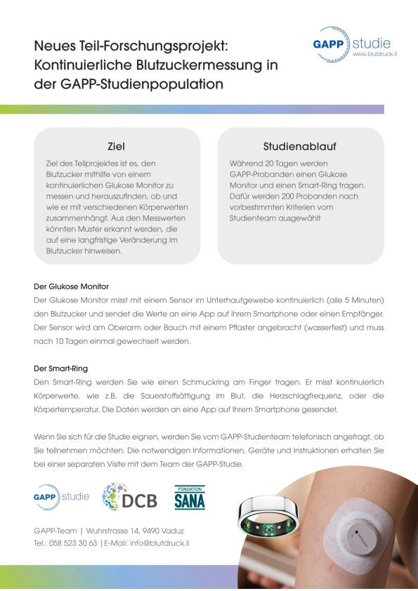 Während 20 Tagen werden GAPP-Probanden einen Glukose Monitor und einen Smart-Ring tragen. Dafür werden 200 Probanden nach vorbestimmten Kriterien vom Studienteam ausgewählt.